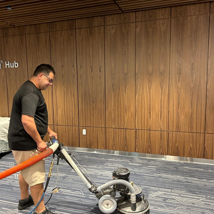 Vital Clean technician operating the RX20 NEXTGEN Rotary Extractor for 1300 times cleaner Hot Water Extraction (HWE).